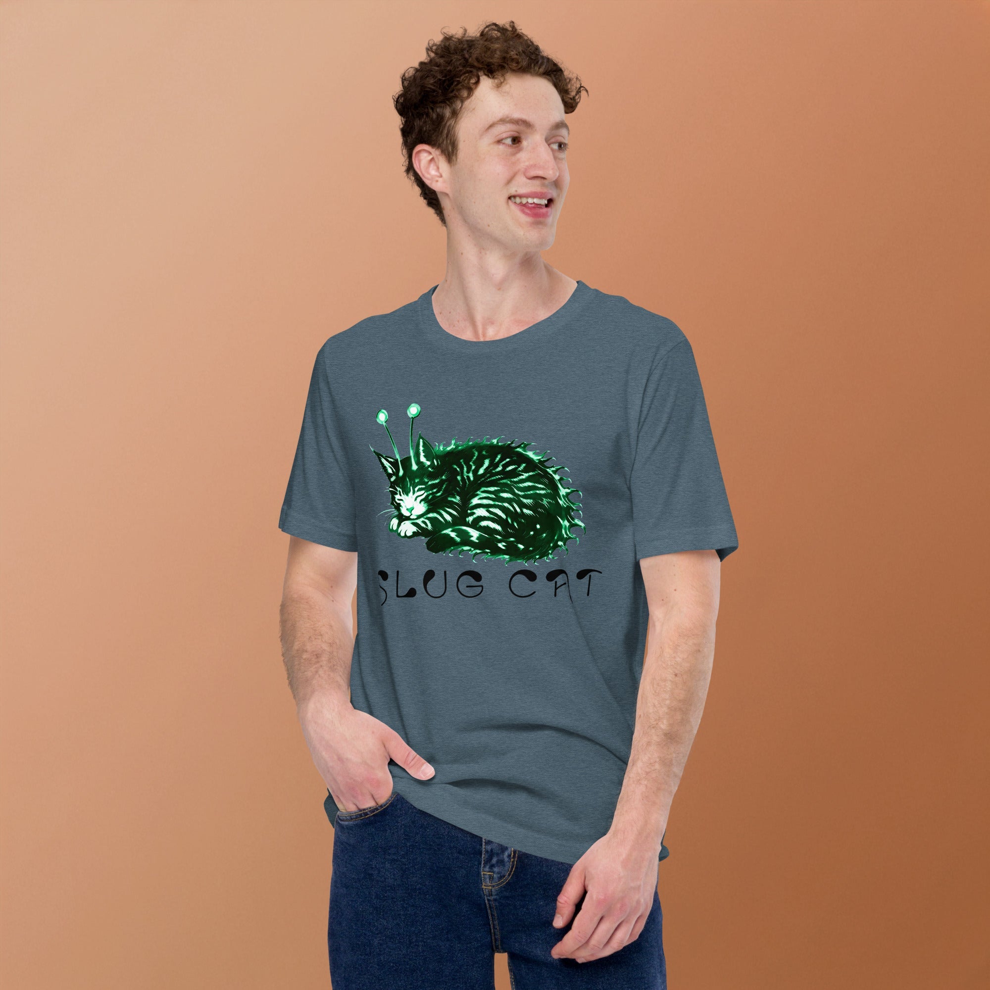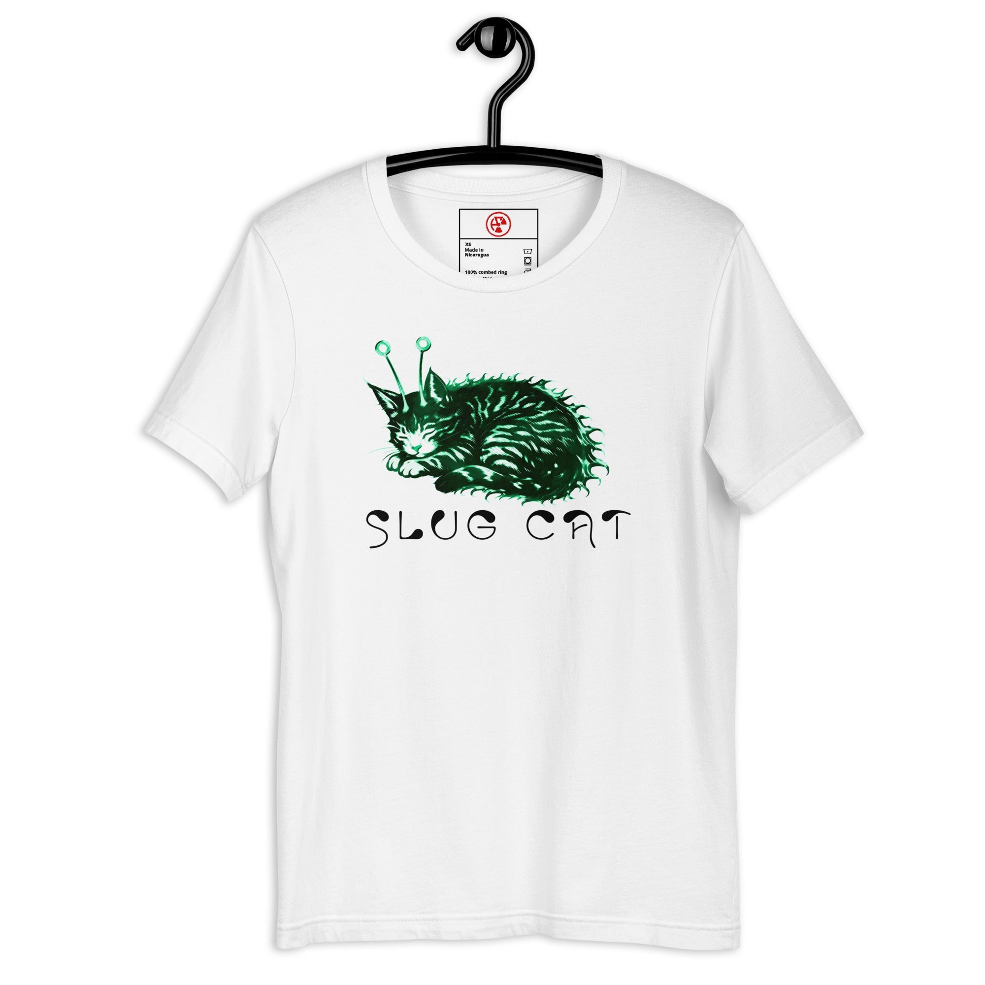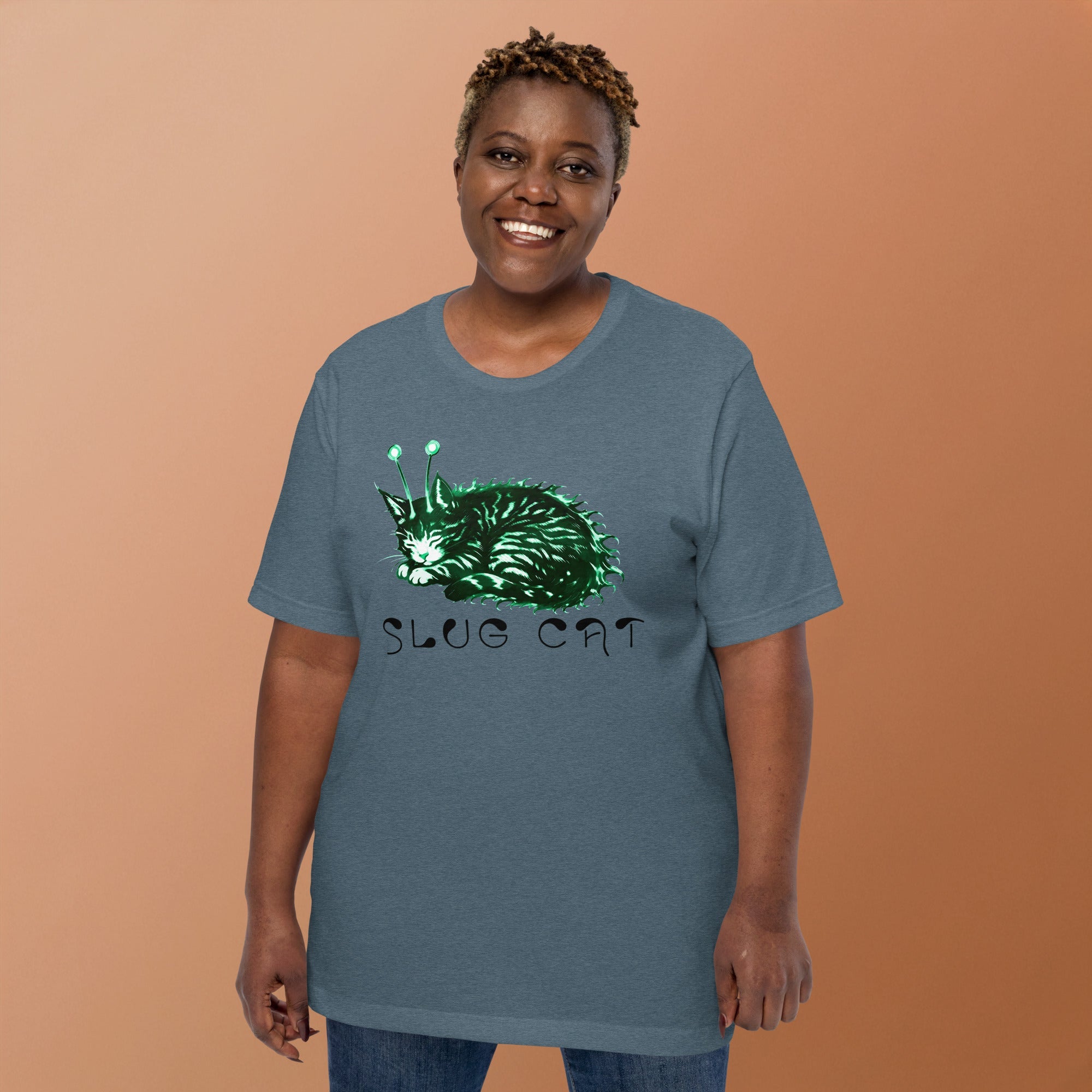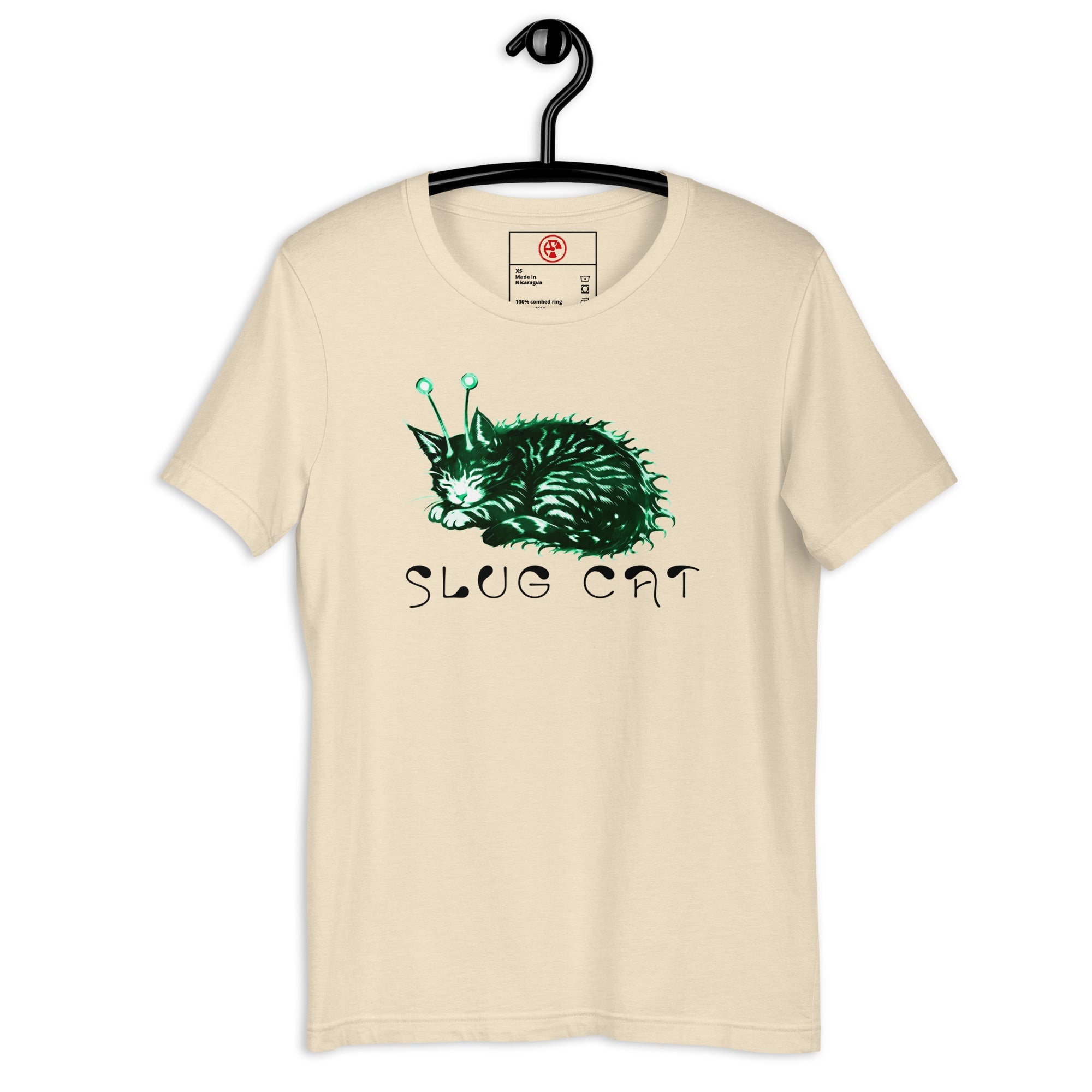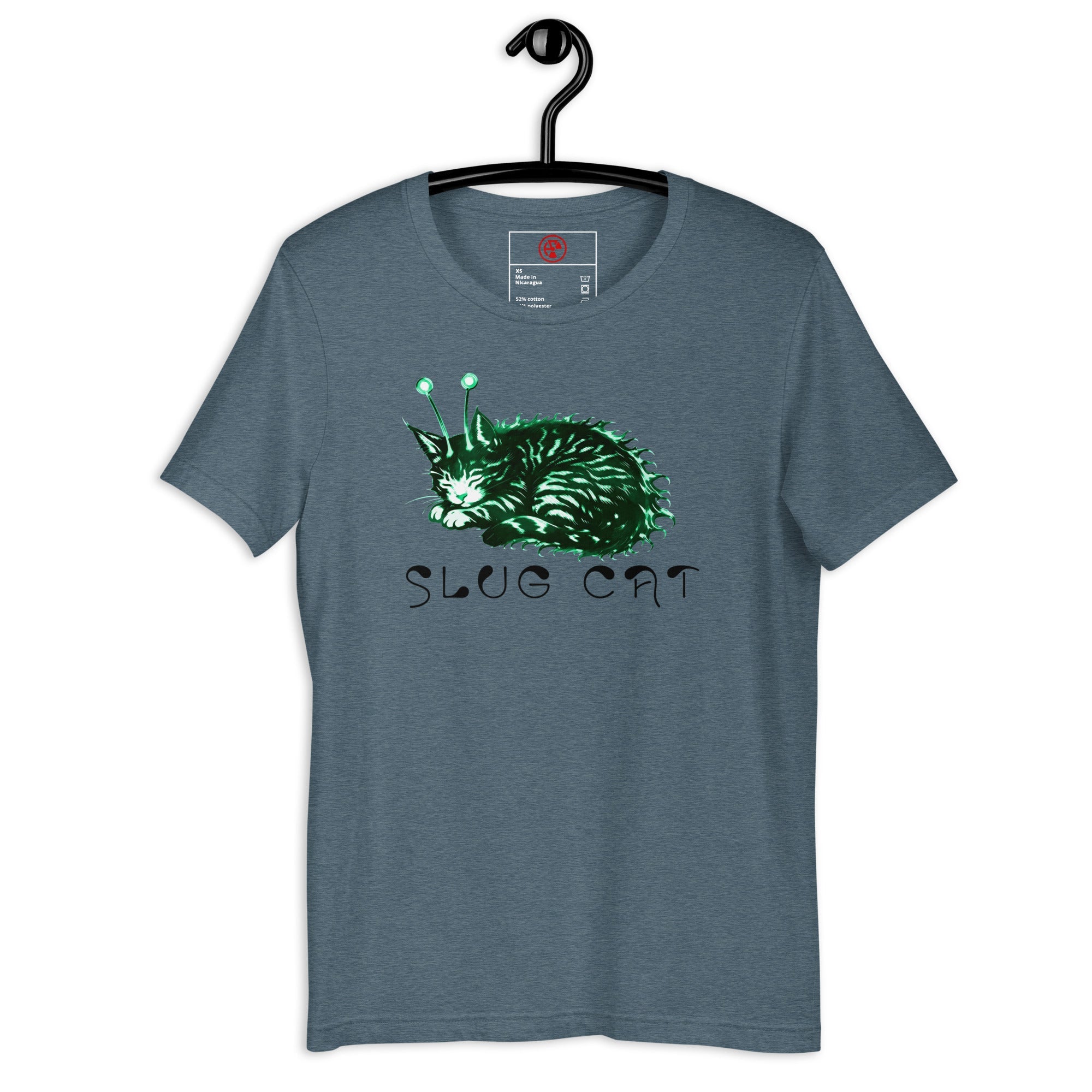 This unisex tee features Slug Cat in her mutated form — gravity-optional, slime-trailing, and radiating the kind of cosmic indifference that most people spend decades in therapy trying to achieve. The Atomic Heart Engine scanned her emotions and found exactly one: mild annoyance at being scanned.